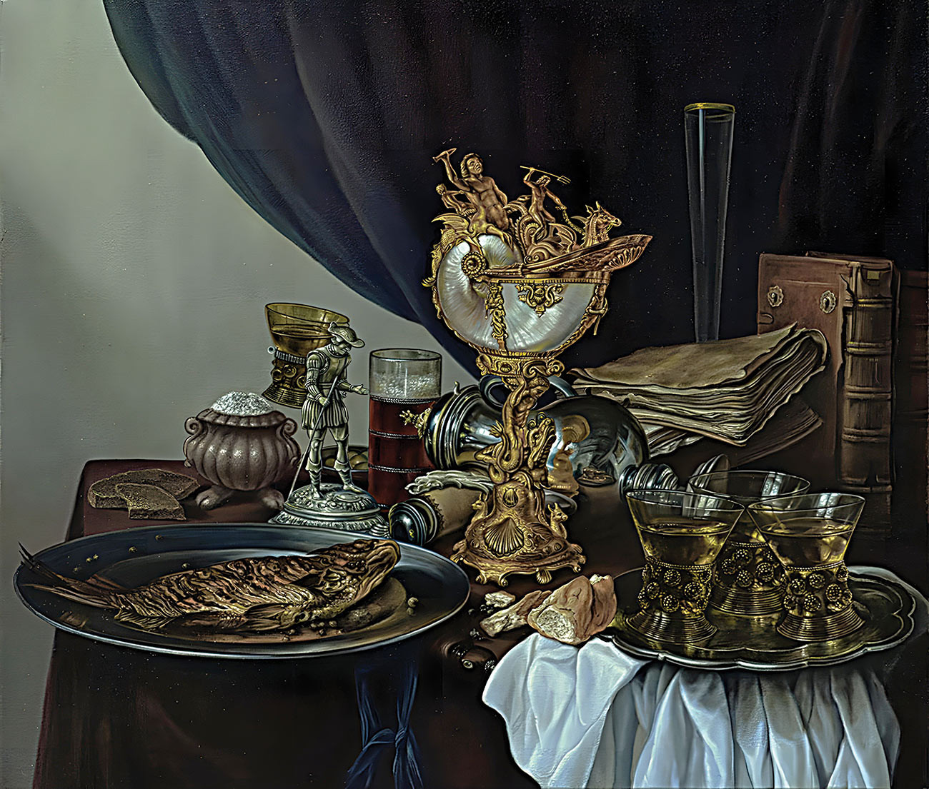 На столі перед фіранкою видно чашку з наутилусом, склянки, книги та їжа. Зазвичай цей натюрморт приписувався харлемському художнику Пітеру Класу. Проте складна композиція і груба техніка роблять це малоймовірним: ймовірно, це Герріт Віллемс Хеда, який наслідував роботи свого батька Віллема Хеди, але чия техніка грубіша, а композиції більш захаращені.