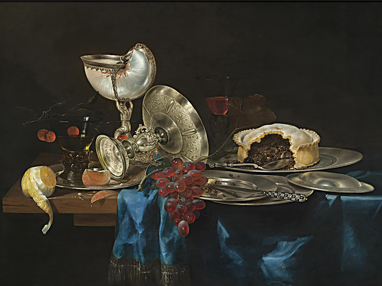 придбайте репродукцію натюрморт художника Хеда Герріта — "Натюрморт із чашкою наутілуса, м'ясним пирогом, гроном винограду, кількома олов'яними тарілками та частково очищеним лимоном, все це розкладено на частково драпірованому столі"