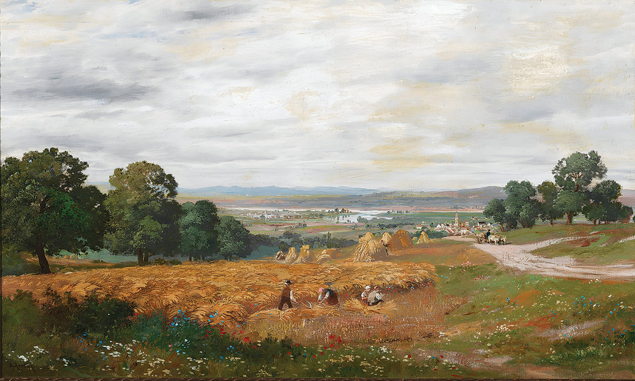 репродукция пейзажа известного художника Арнегера Алоиса — "Огромный летний пейзаж со сбором сена"