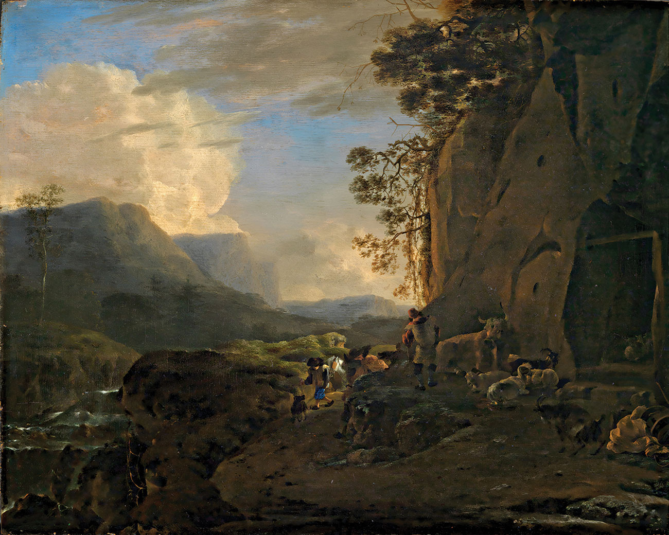 ₴ Репродукция пейзаж "Скалистая горная долина с ручьем и группой пастухов" - Асселин Ян
