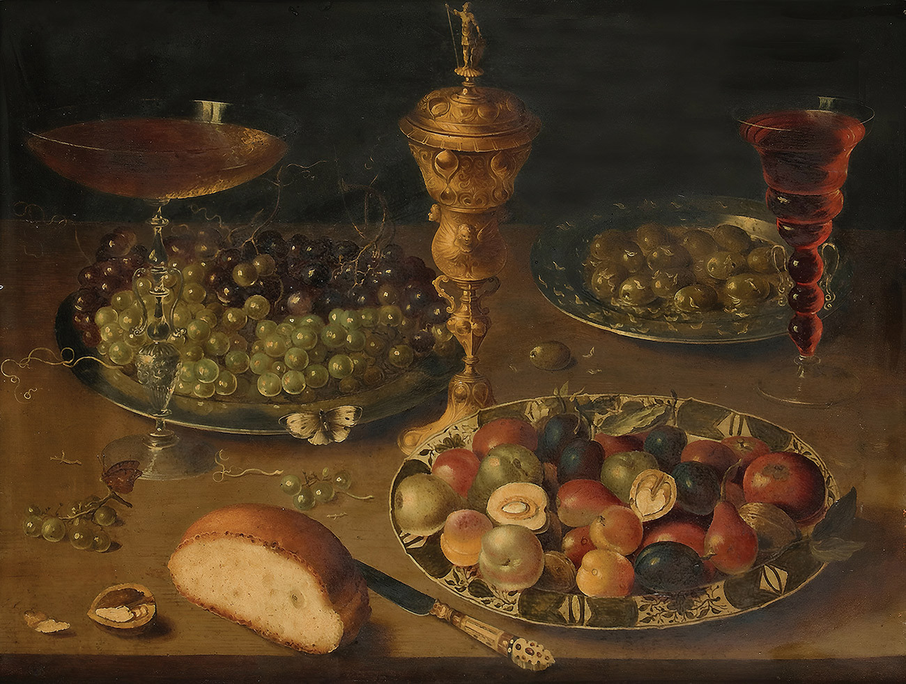 «Натюрморт с ханапом, тарелкой из винограда, миской из фруктов, оливками, хлебом и бокалом вина» Осиаса Берта – это искусный натюрморт, образец склонности голландского Золотого века к тщательно продуманным деталям и символическому изображению.