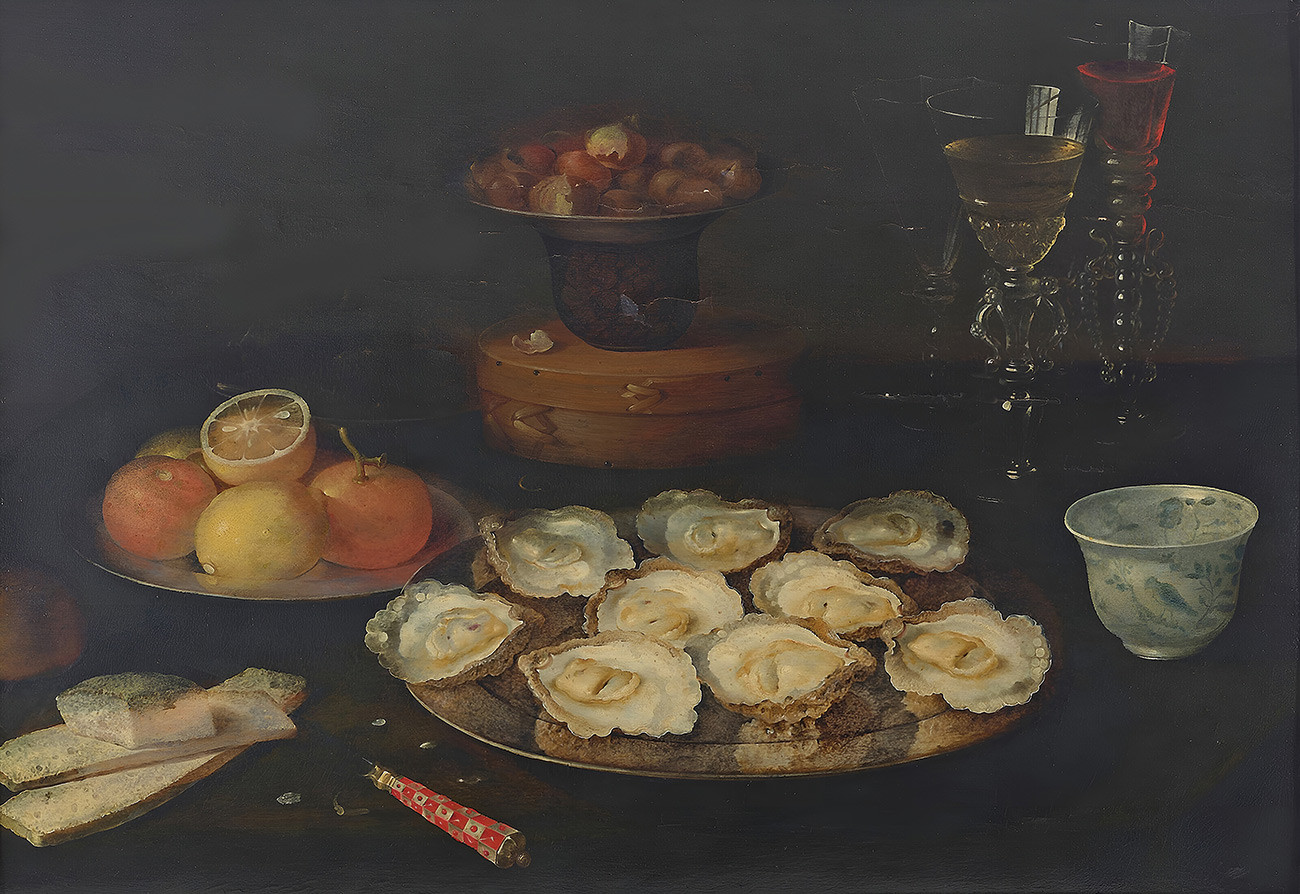 Натюрморт Осиас Берт «Устрицы на оловянной тарелке, фарфоровая миска Ванли, три бокала для вина в венецианском стиле, апельсины, лимоны» является примером тщательной детализации и роскошной тематики, характерных для фламандской живописи XVII века.