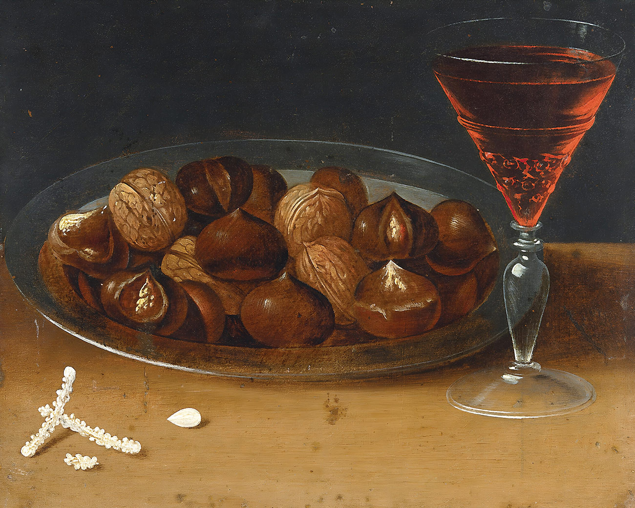 купите репродукцию натюрморт известного художника Берта Осиаса — "Натюрморт с блюдом каштанов и грецких орехов, бокал красного вина"