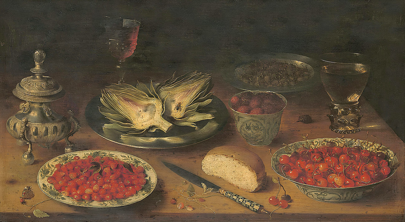 ₴ Репродукция натюрморт известного художника "Натюрморт с артишоком, фруктами в фарфоровой посуде Kraak, солонкой и перечницей" - Берт Осиас