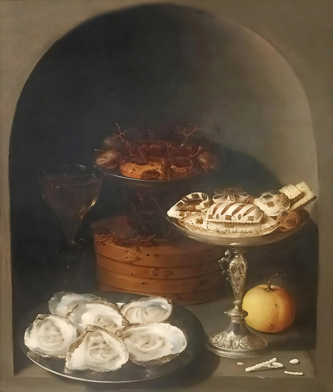купите репродукцию натюрморт известного художника Берта Осиаса — "Натюрморт с устрицами, сладостями и сухофруктами в каменной нише"