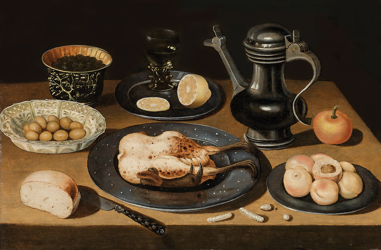₴ Репродукция натюрморт известного художника "Натюрморт с жареной курицей, оливками, фруктами и хлебом" - Берт Осиас