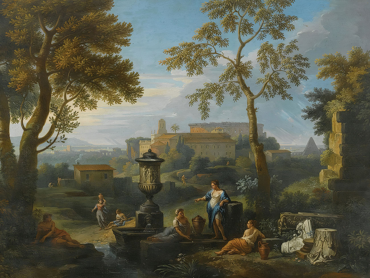 ₴ Репродукция пейзажа "Фигуры сидящие на руинах в итальянском пейзаже" - Блумен Ян Франс ван