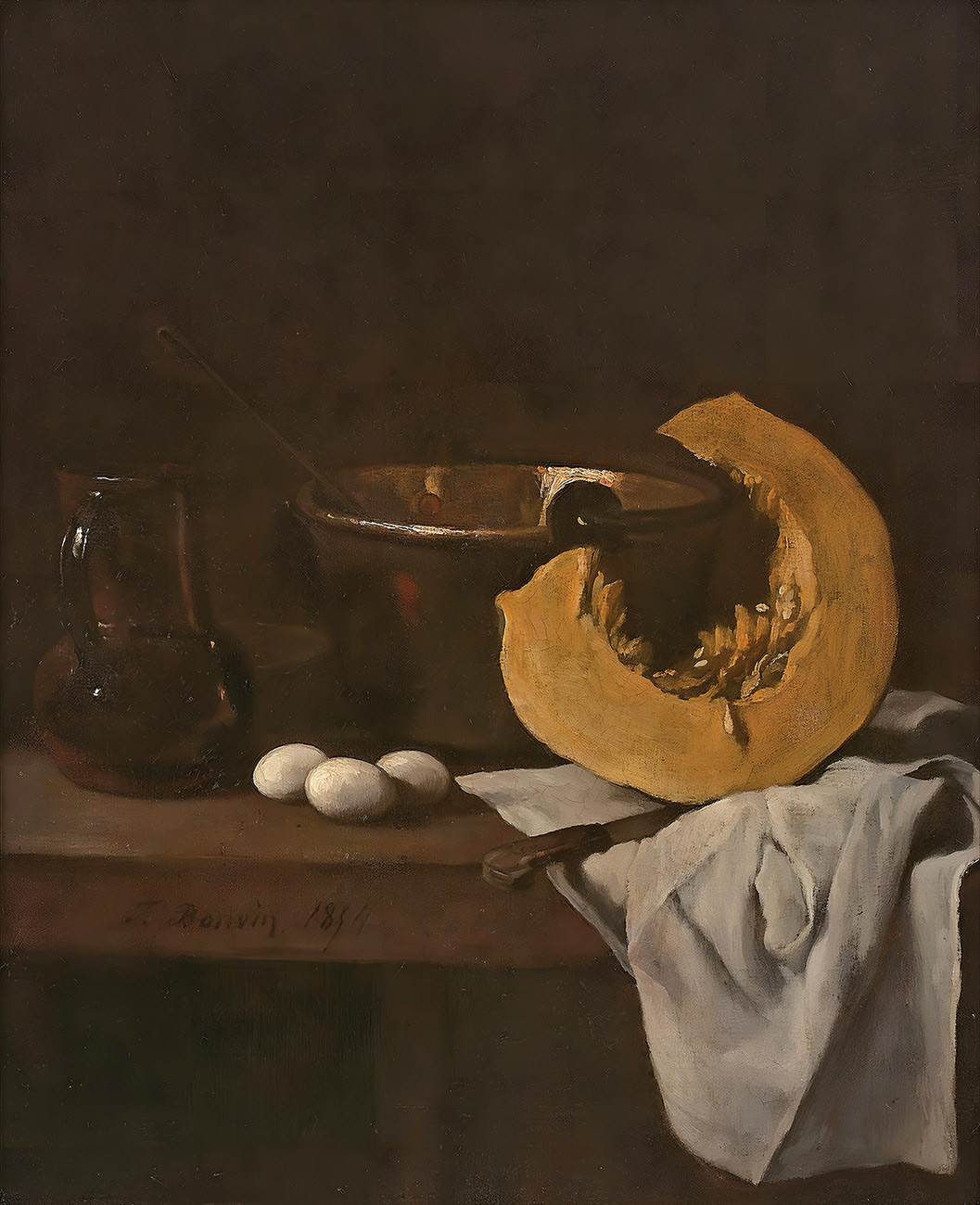 купите репродукцию натюрморт художника Бонвена Франсуа — "Яйца, тыквенный клин и медный умывальник на антаблементе"