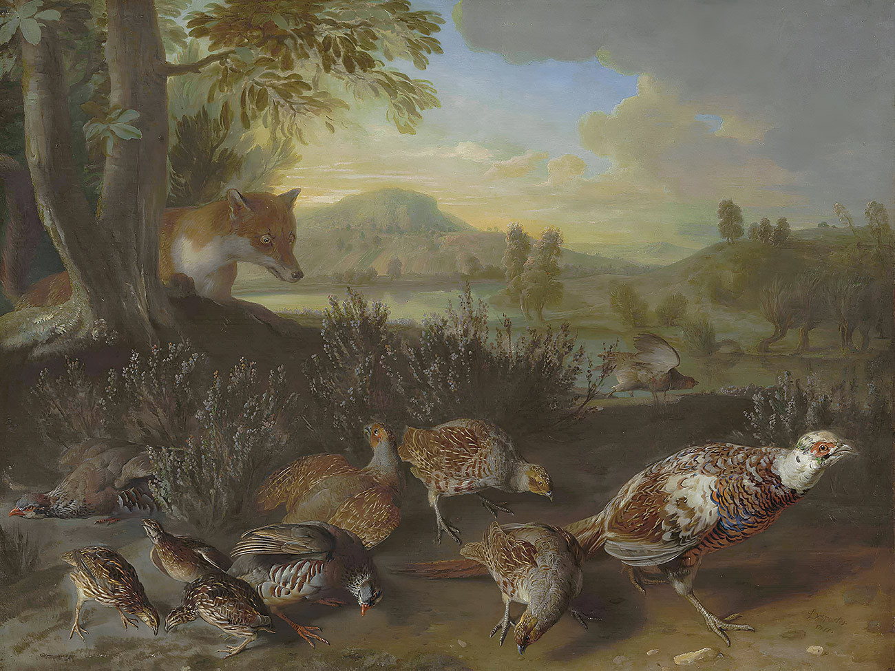 купите репродукцию натюрморт известного художника Депорта Александра — "Английская и французская куропатки, выводок перепелов и декоративный фазан, потревоженные лисой на берегу реки"