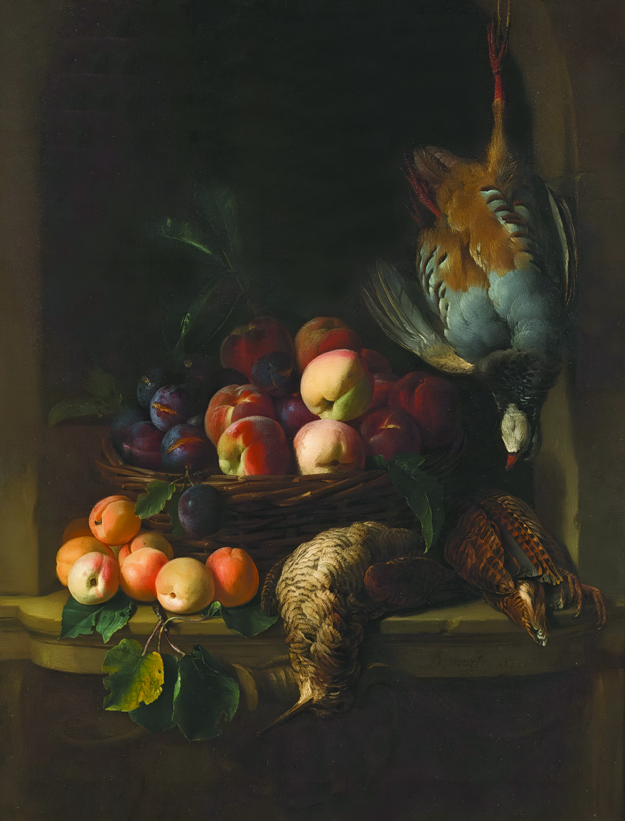 купите репродукцию натюрморт известного художника Депорта Александра — "Куропатка, вальдшнеп, корзина персиков, слив и абрикосов, фазан, куропатка, абрикосы в чаше имари и инжир на постаменте"
