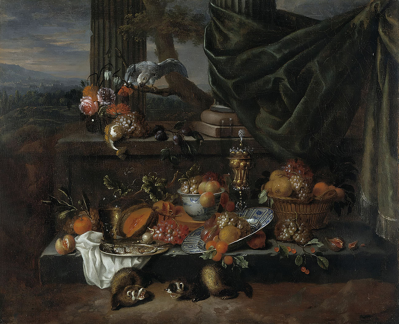 купите репродукцию натюрморт известного художника Депорта Александра — "Натюрморт с фруктами, попугаем и хорьками"