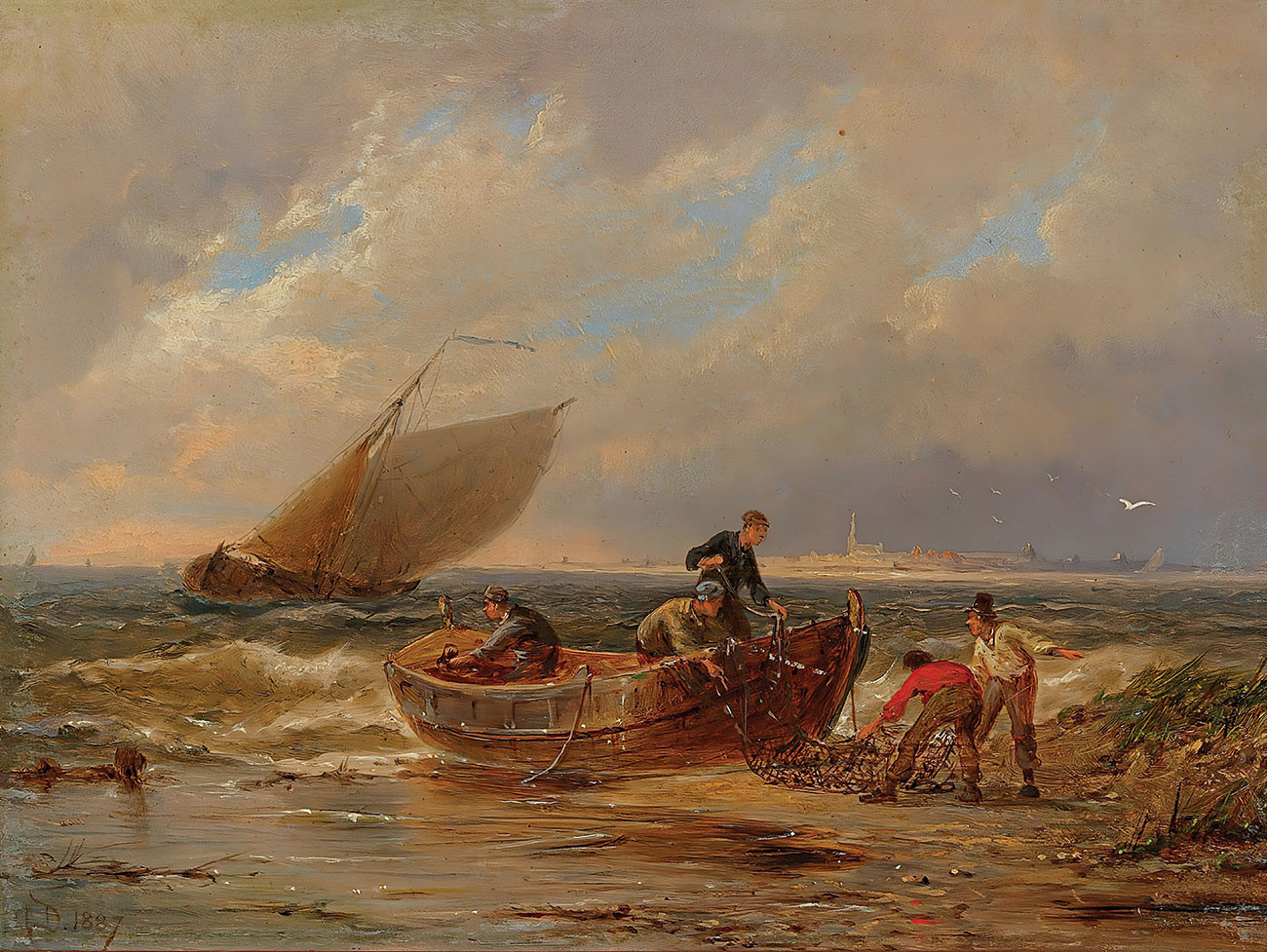 репродукция морского пейзажа художника Домерсена Питера Корнелиса — "Прибытие рыбаков"