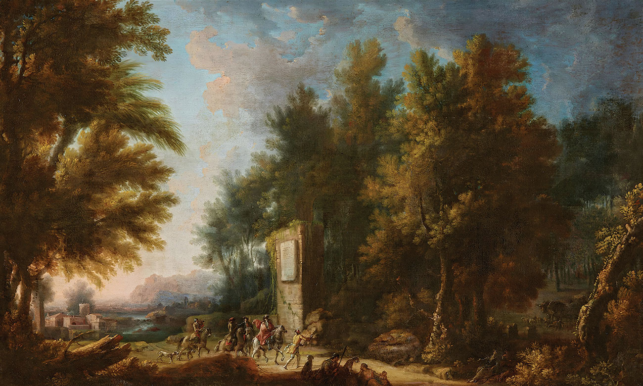 репродукция пейзажа художника Дзуккарелли Франческо — "Южный пейзаж с элегантной охотничьей компанией"