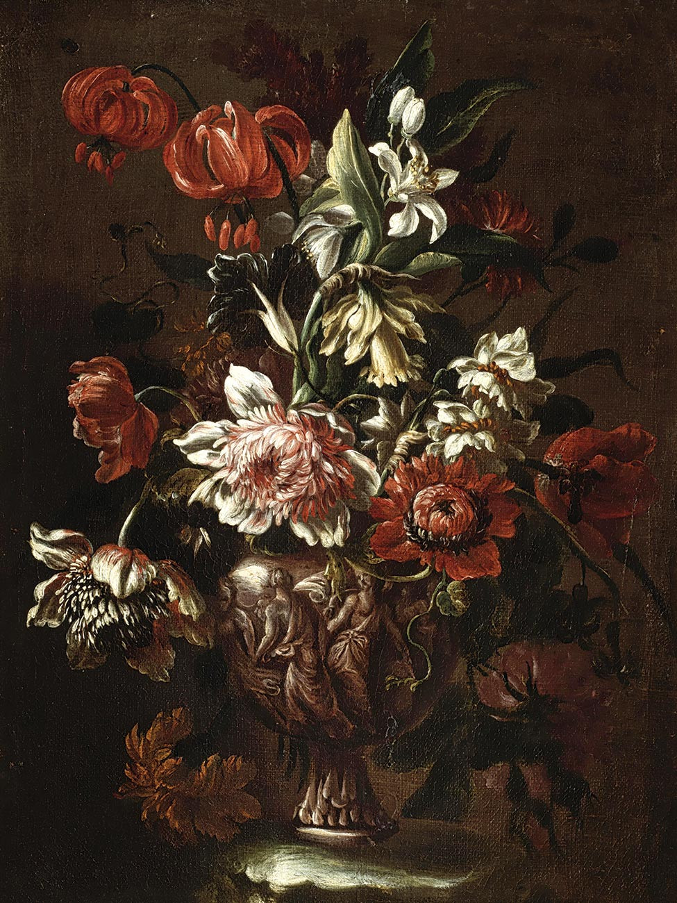 ₴ Репродукция цветочный натюрморт художника "Натюрморт с цветами в бронзовой урне, лимонами на выступе под ней"