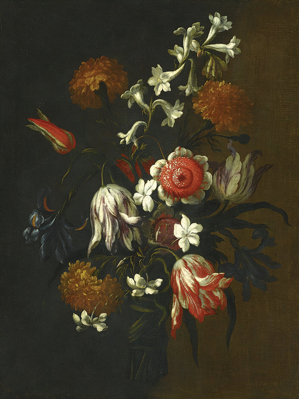 купите репродукцию цветочный натюрморт художника Фьори Де Марио — "Два натюрморта с тюльпанами, розами и другими цветами, связанными в пучки"