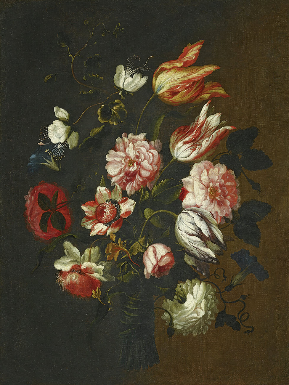 купите репродукцию цветочный натюрморт художника Фьори Де Марио — "Два натюрморта с тюльпанами, розами и другими цветами, связанными в пучки"