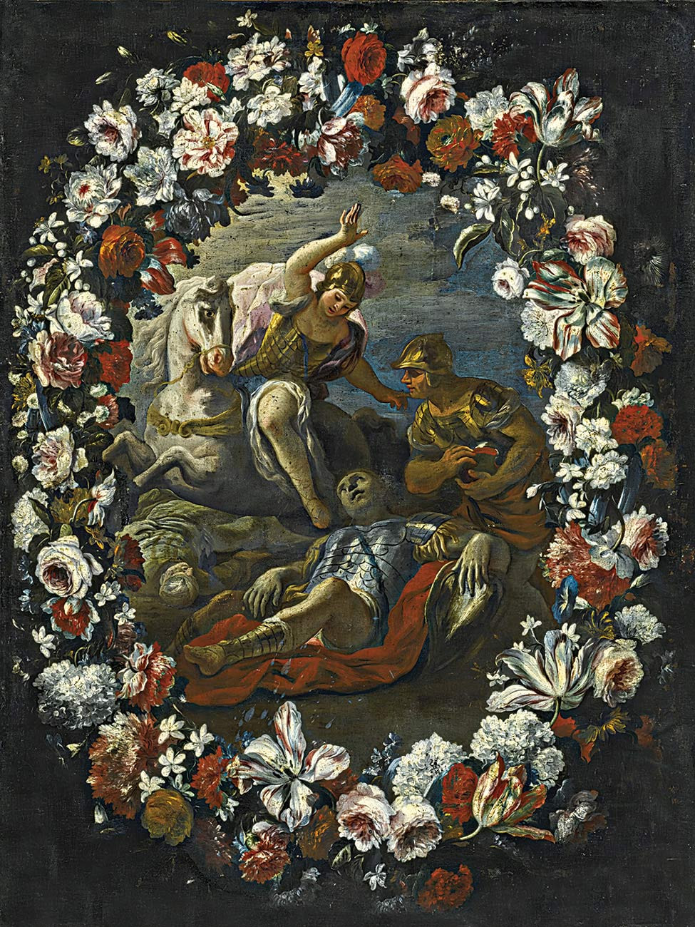 Выразительная композиция Марио Де Фьиори «Танкред и Эрминия в окружении цветочного венка» представляет собой изысканную визуальную интерпретацию трогательного повествования эпической поэмы Торквато Тассо «Освобожденный Иерусалим».