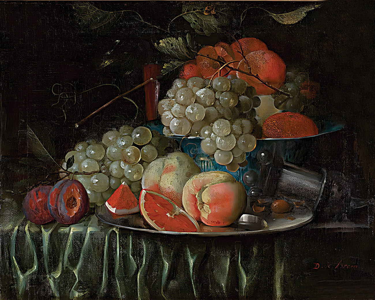 ₴ Репродукция натюрморт "Натюрморт с фруктами на драпированном столе с оловянной тарелкой и китайской фарфоровой миской" - Гиллеманс Ян Пауль