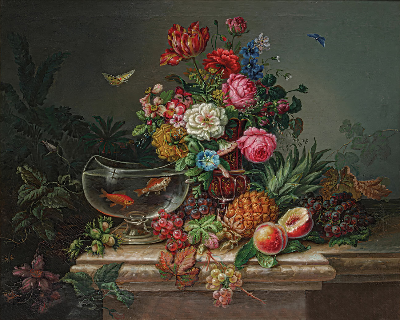₴ Репродукция цветочный натюрморт "Цветы, фрукты и золотые рыбки" - Грубер Франц Ксавер