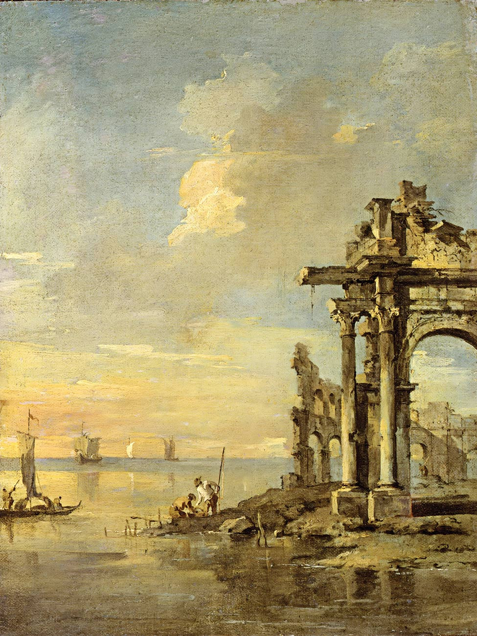 репродукция картины известного художника Гварди Франческо — "Архитектурная фантазия с римскими руинами и лагуной"