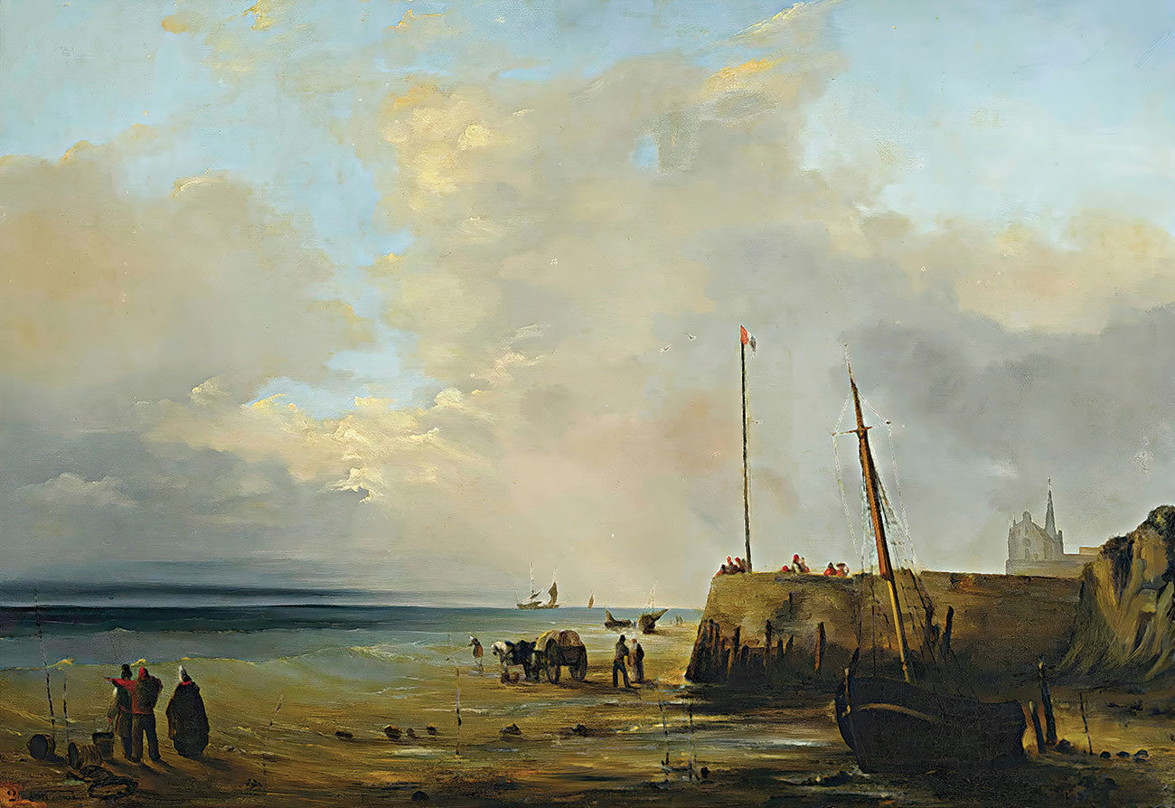 репродукция морского пейзажа художника Гюдена Теодора — "Рыбалки у стены гавани, отлив"