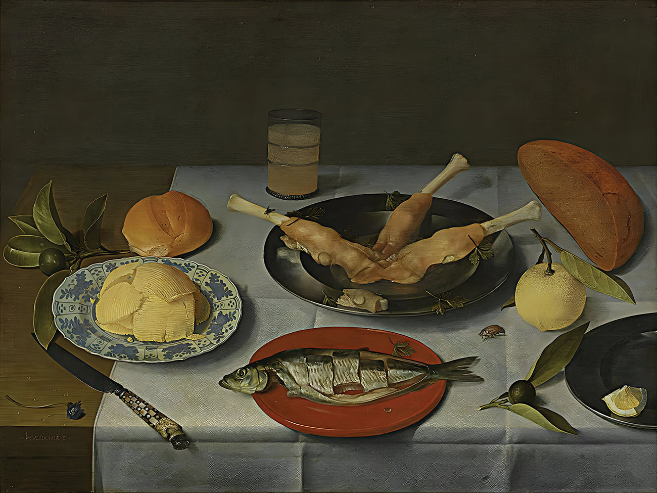 купить репродукцию натюрморт известного художника Халсдонка Якоба — "Завтрак с хлебом, сыром, рыбой и пивом"