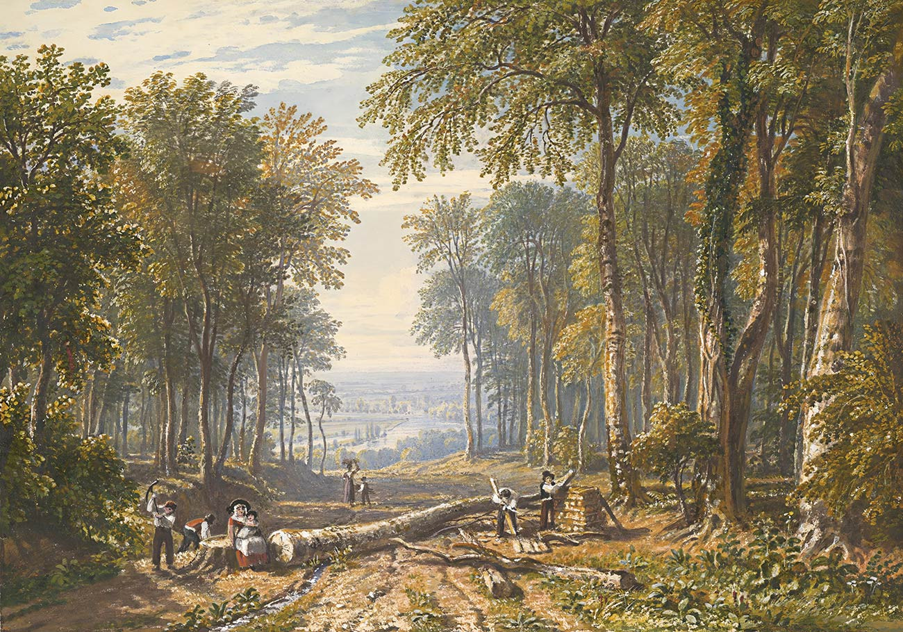 Голубоватая отрисовка далекой Темзы закрепляет сцену около Хенли - вид, созданный, когда владелец поместья прокладывает новую дорогу через лес. Мужчины, работающие на срубленном дереве, и женщина, отдыхающая на солнце со своим ребенком, оживляют передний план.