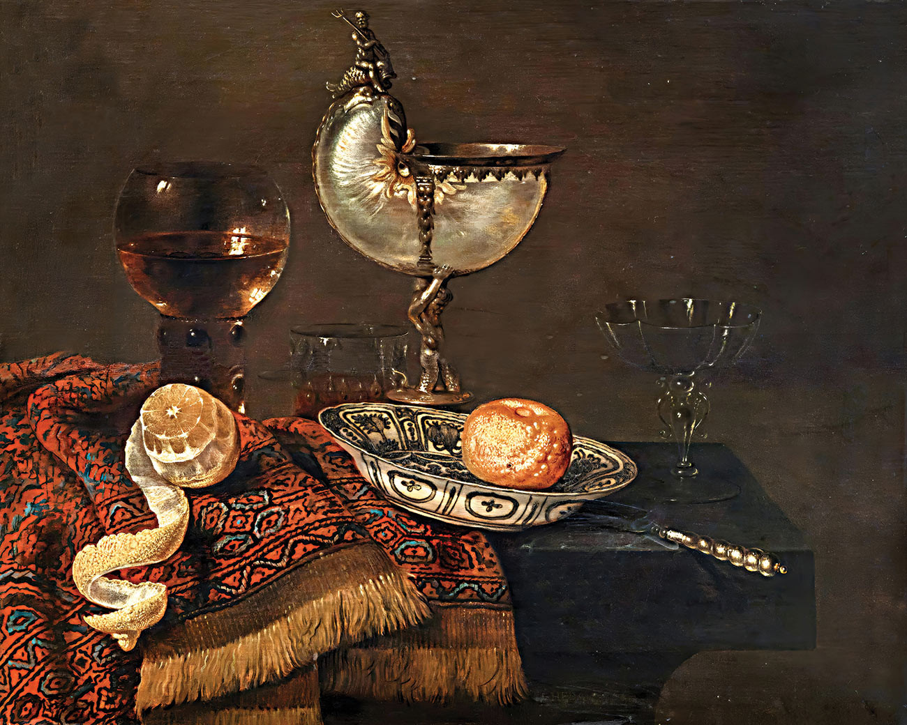 ₴ Репродукция натюрморт известного художника "Клементин в фарфоровой миске, чашка с наутилусом, ремер, два стакана, нож, очищенный от кожуры лимон на декоративном ковре на столе" - Хеда Виллем Клас