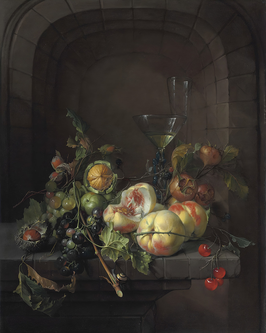 купить репродукцию натюрморт известного художника Хема Давида — "Персики, виноград, мушмула, грецкие орехи, фундук, вишня и черная малина с улиткой, бокалом вина в стиле «Венеция» и бокалом-флейтой на каменном выступе перед нишей"