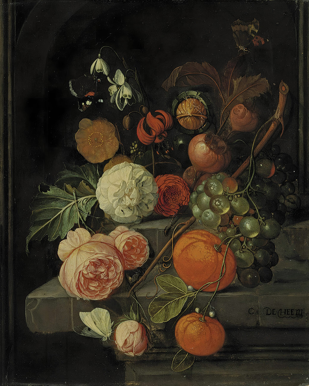 купить репродукцию натюрморт известного художника Хема Давида — "Розы, лилии, виноград, апельсины и конские каштаны на каменном выступе с бабочками, муравьями и пчелой"