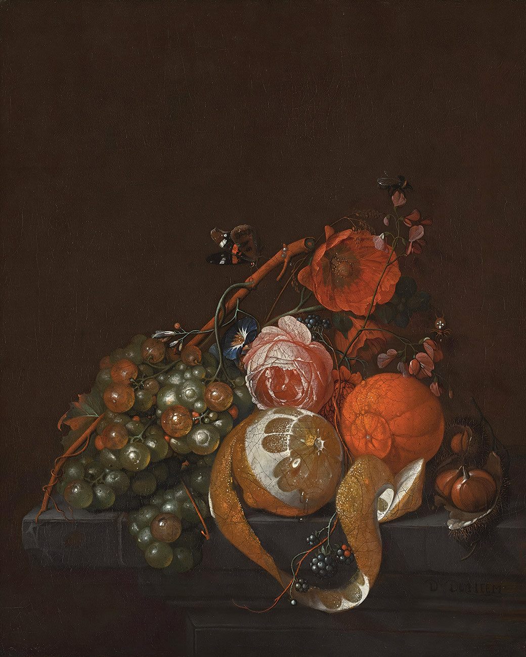 купить репродукцию натюрморт известного художника Хема Давида — "Натюрморт с цветами, лимоном, мандарином и другими фруктами"