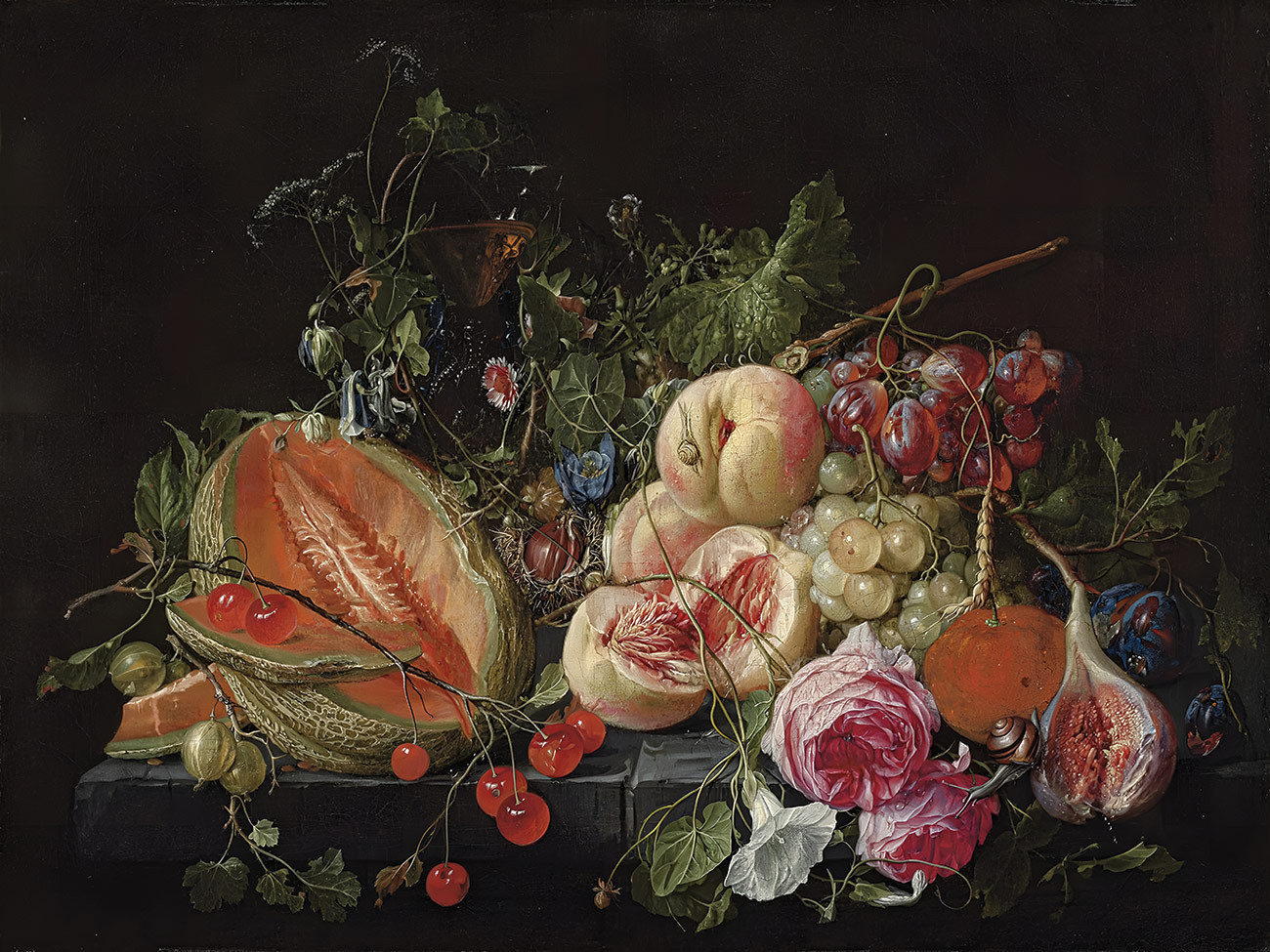 купить репродукцию натюрморт известного художника Хема Корнелиса — "Разрезанная дыня, вишни, крыжовник, персики, виноград, инжир, сливы, цветы, улитки и насекомые на каменном выступе"
