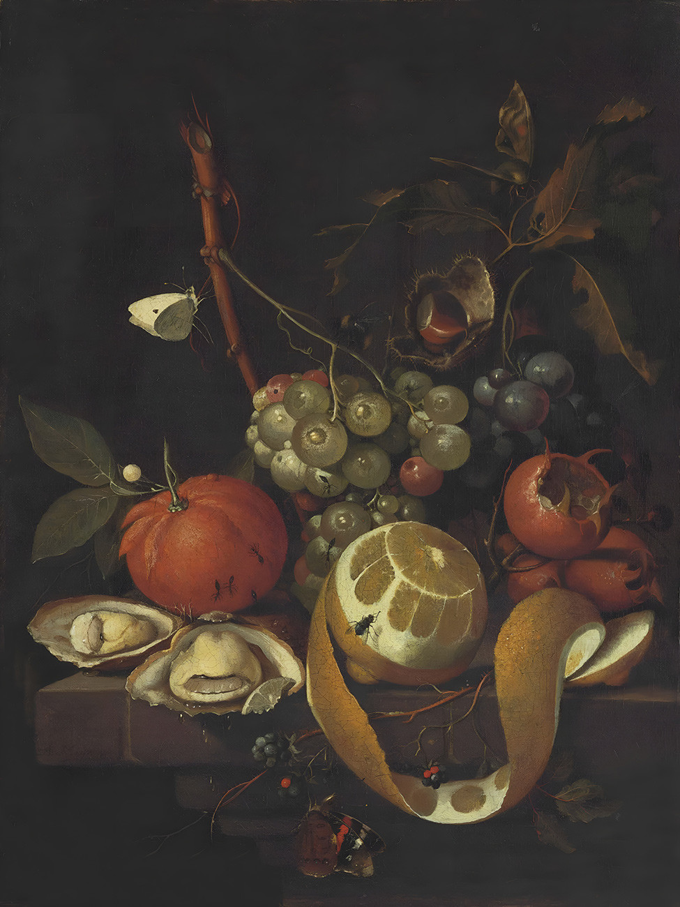 ₴ Репродукция натюрморт известного художника "Натюрморт с виноградом, частично чищенным лимоном, устрицы, каштан, ежевика на выступе" - Хем Корнелис де