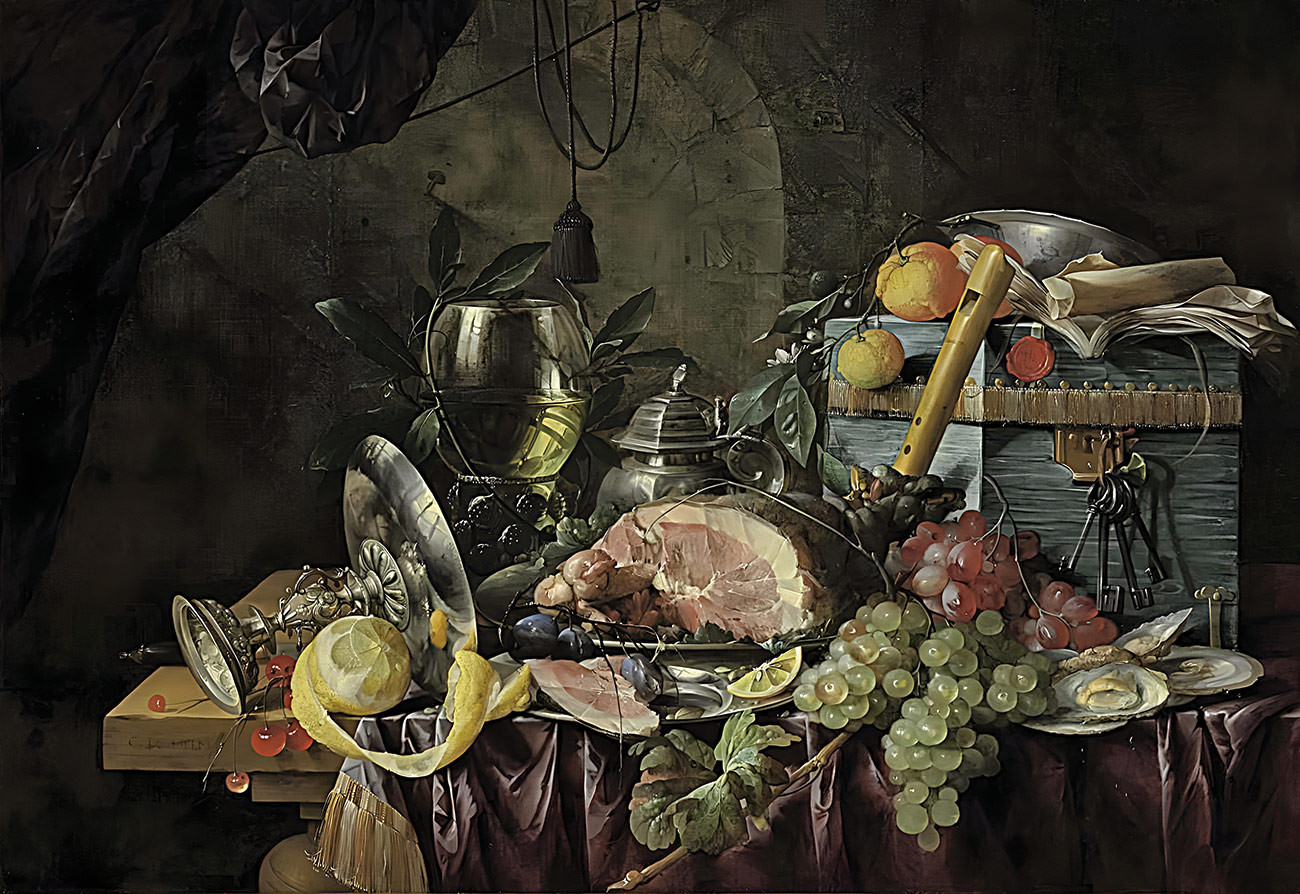 ₴ Репродукция натюрморт известного художника "Ветчина на оловянной тарелке, виноград, ягоды, сливы, лимоны и устрицы с ремером, подносом, кувшином, фарфоровой тарелкой ван-ли, блокфлейтой, книгой и ящиком на драпированном столе в нише" - Хем Корнелис де