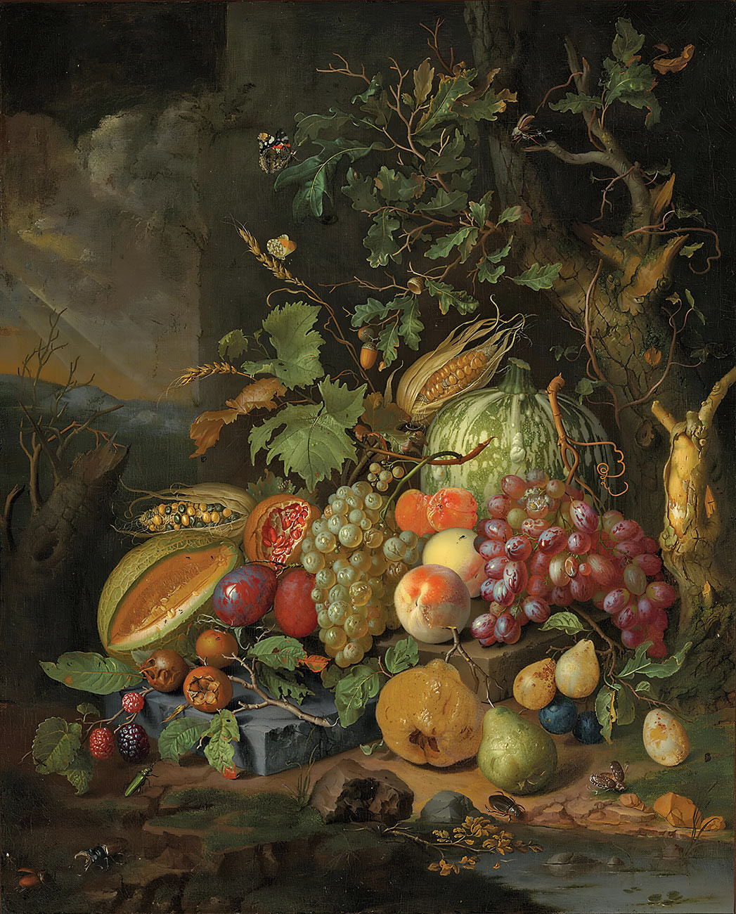 купить репродукцию натюрморт известного художника Хема Яна — "Дыня, персики, виноград, сливы и другие фрукты и овощи с насекомыми на лесной подстилке"