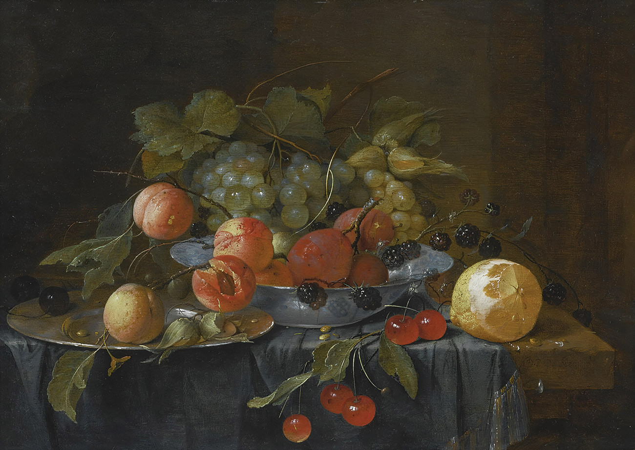 ₴ Репродукция натюрморт известного художника "Натюрморт с фруктами на оловянной тарелке и в фарфоровой миске ванли крак, частично очищенный лимон и веточка вишен на столе, застеленном скатертью с золотой каймой" - Хем Ян Давидс де