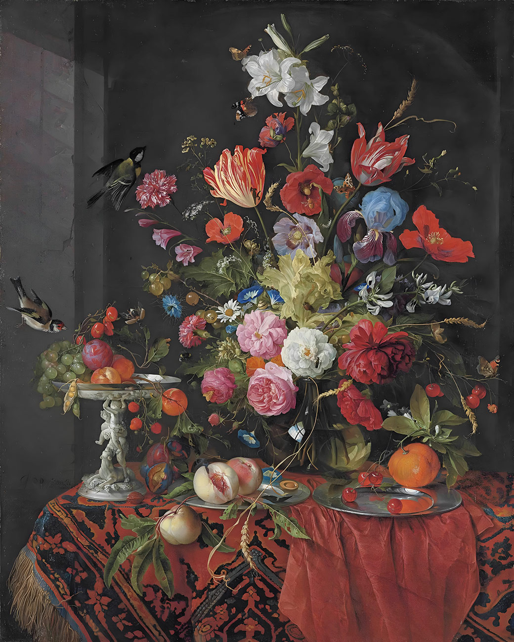 купить репродукцию натюрморт известного художника Хема Яна — "Цветы в стеклянной вазе на драпированном столе с серебряной таццей, фруктами, насекомыми и птицами"