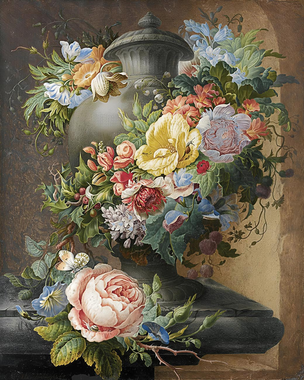 купить репродукцию натюрморт художника ХенстенбургА Генри — "Урна, увитая цветами с различными насекомыми и улитками в каменной нише"