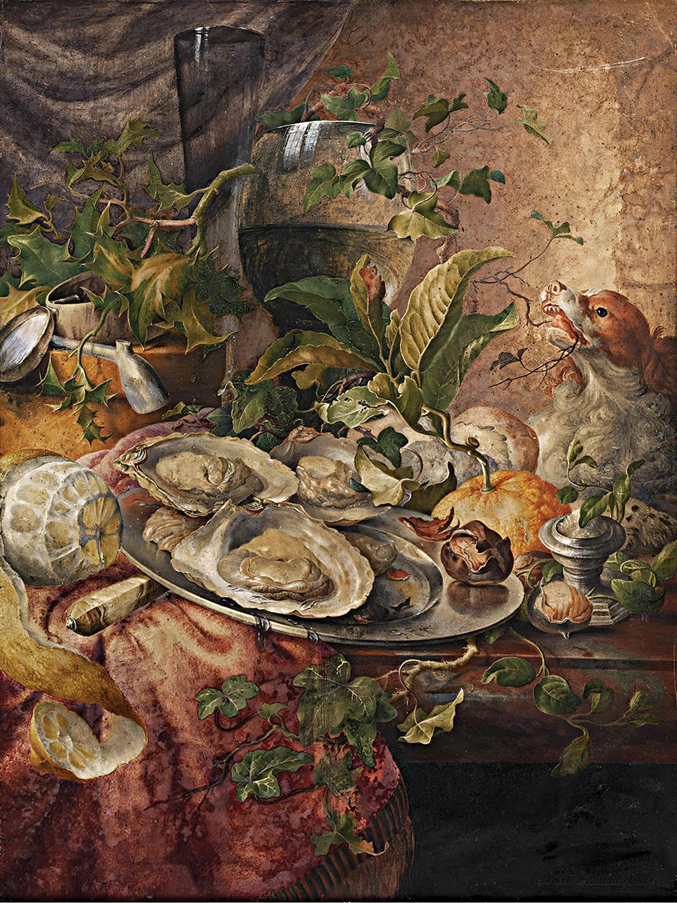 купить репродукцию натюрморт художника Хенстенбурга Генри — "Натюрморт с устрицами, зеленью, бокалами, собакой и другими объектами"