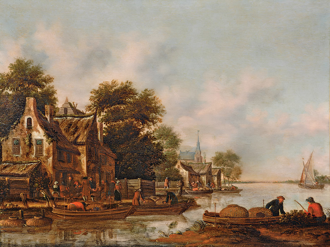 ₴ Репродукция пейзаж "Речной пейзаж с фигурами людей, загружающих рыболовные ловушки в лодки с берега возле деревни" - Хереманс Томас