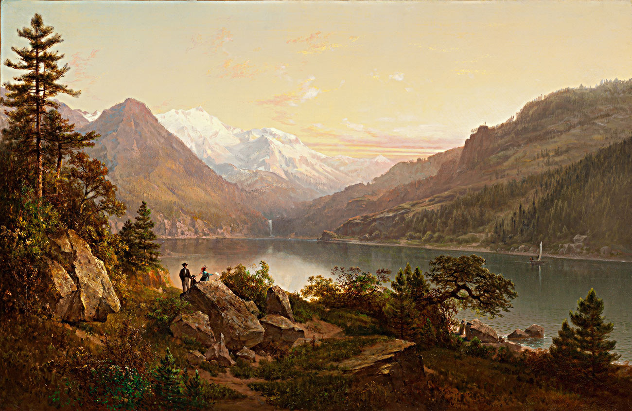 Солнечный свет пляшет на поверхности озера, освещая далекое лесистое побережье и отбрасывая длинные тени на всю сцену. Искусное использование Хиллом света и тени создает ощущение глубины и атмосферы, перенося зрителя в эту увлекательную природную среду.