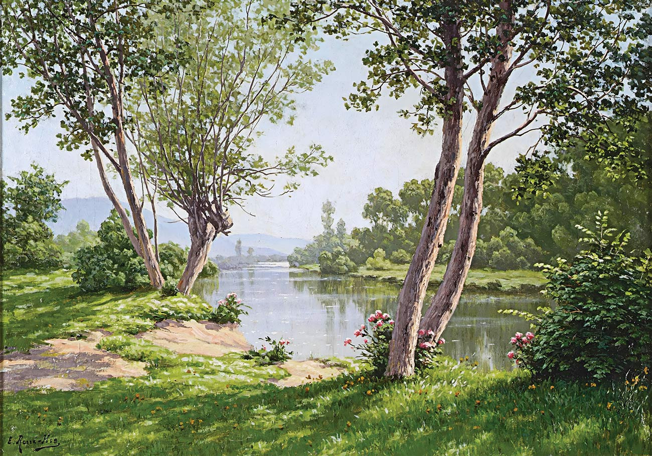 репродукция картины художника Хиса Рене — "Поляна на берегу реки"