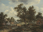 ₴ Репродукция пейзаж известного художника "Лесистый речной пейзаж с домом, прохожими и рыболовом" - Хоббема Мейндерт