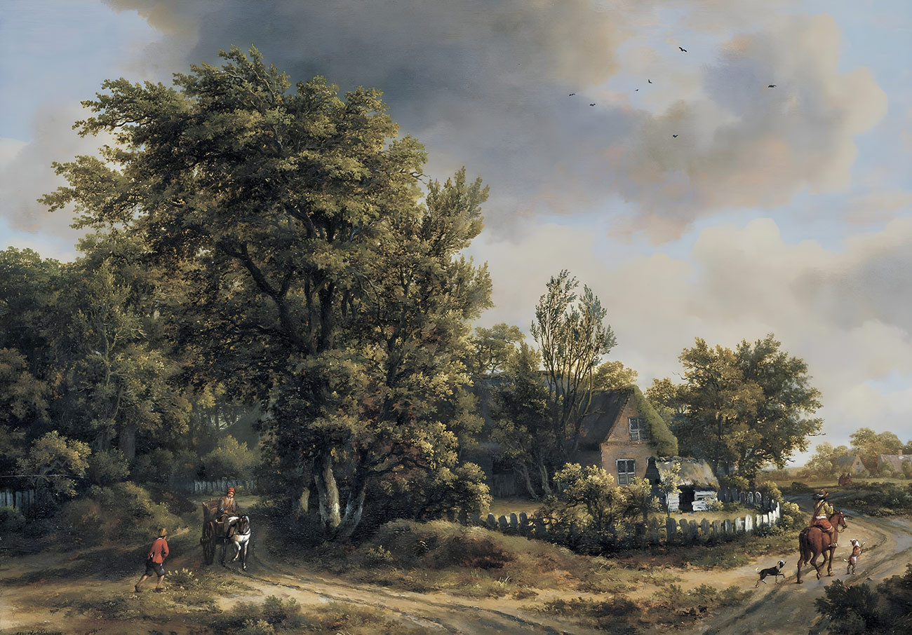 репродукция картины "Лесной пейзаж с путниками на тропинке у дома" известного пейзажиста Мейндерта Хоббемы приглашает ощутить непреходящее очарование природы