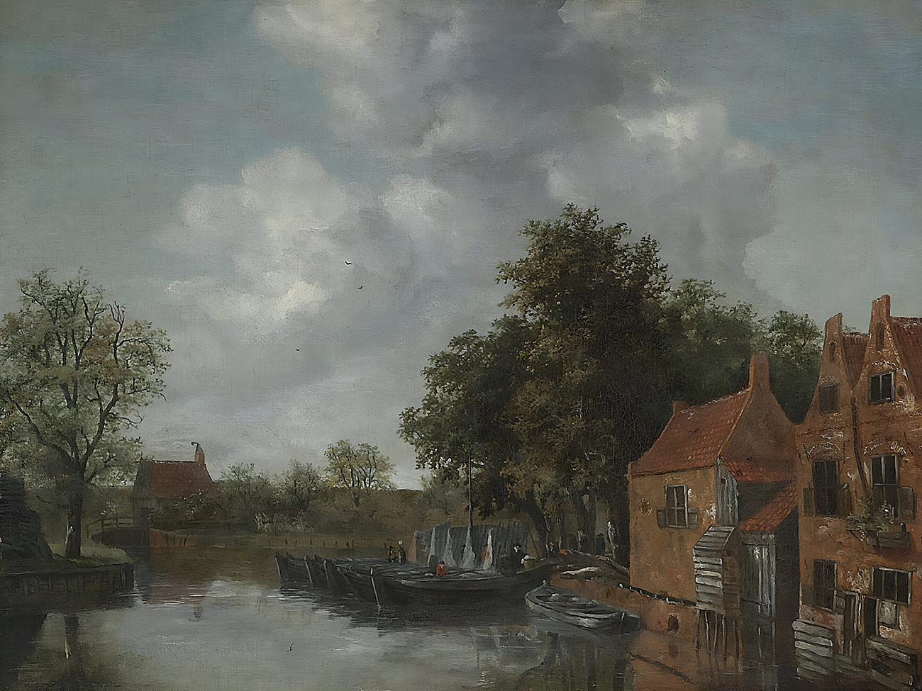 репродукция картины "Вид на канал в голландской деревне с баржами, пришвартованными на набережной возле домов" известного пейзажиста Мейндерта Хоббемы приглашает ощутить непреходящее очарование природы