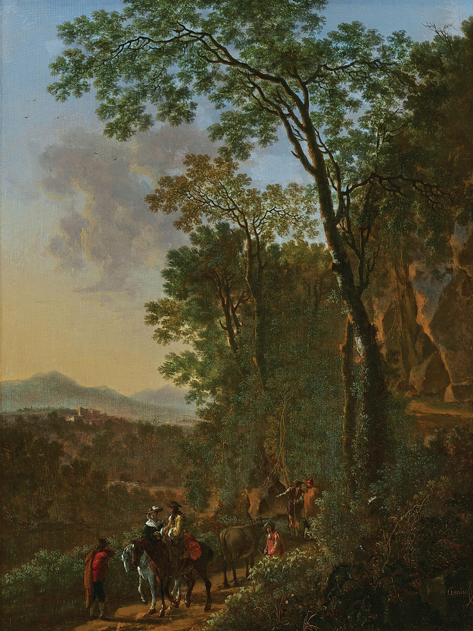 репродукция пейзажа художника Хойша Виллема — "Элегантно одетая пара верхом на конях вместе с путниками в южном пейзаже"