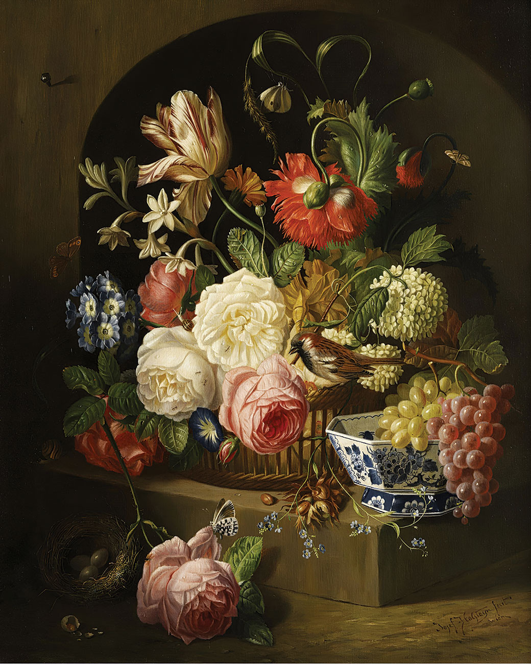 купите репродукцию цветочный натюрморт современного художника Хольстейна Йозефа — "Натюрморт с букетом цветов и фруктами в китайской пиале"