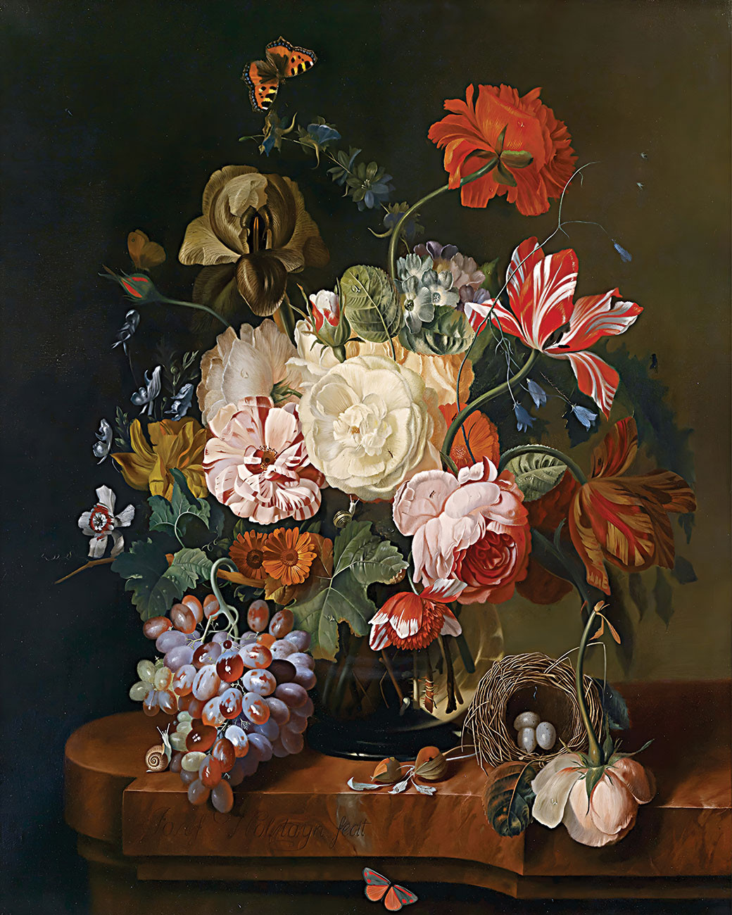 ₴ Репродукция цветочный натюрморт "Букет цветов в стеклянной вазе и гнездом" - Хольстейн Йозеф