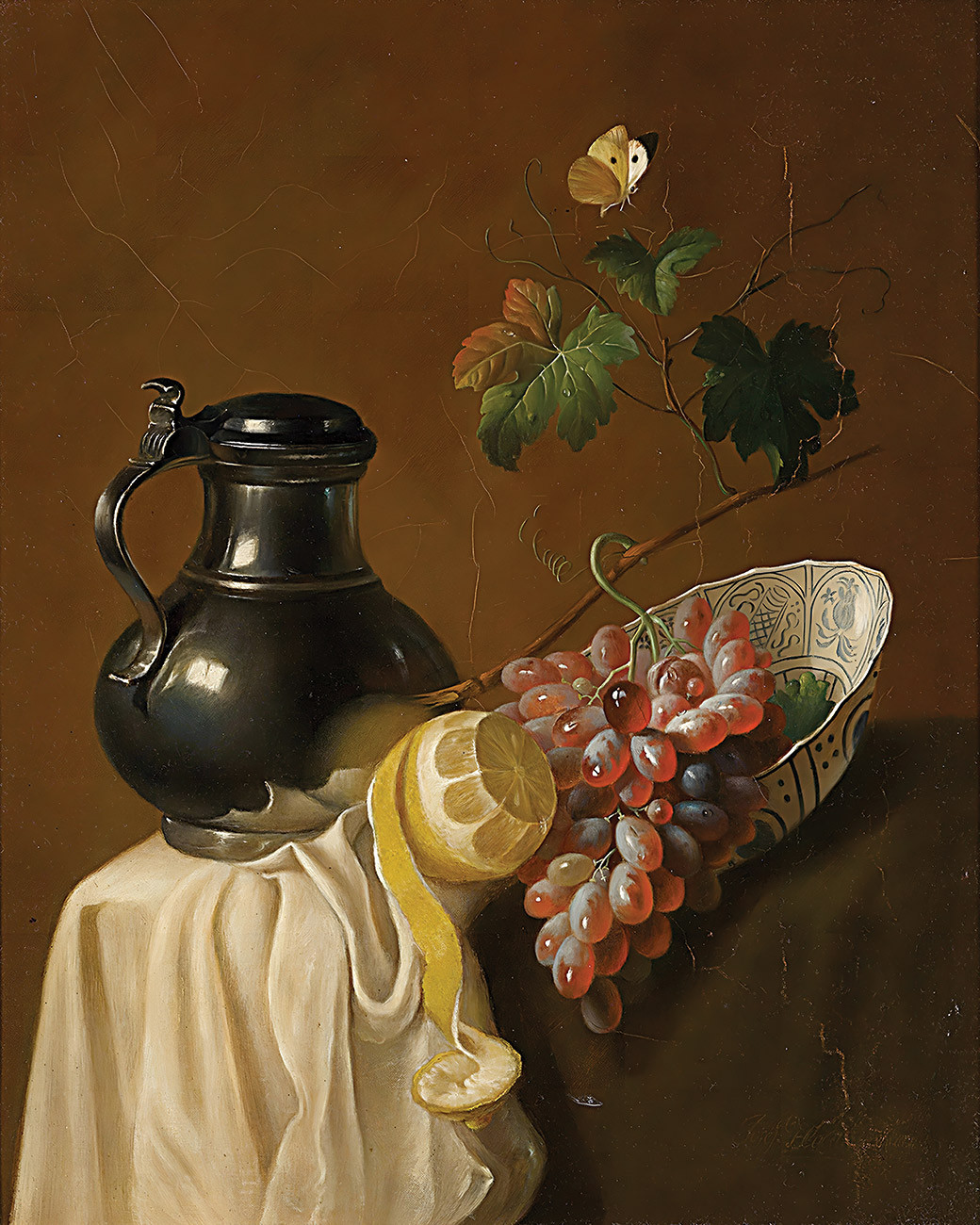 ₴ Репродукция натюрморт "Натюрморт с лимоном, виноградом и бабочкой" - Хольстейн Йозеф