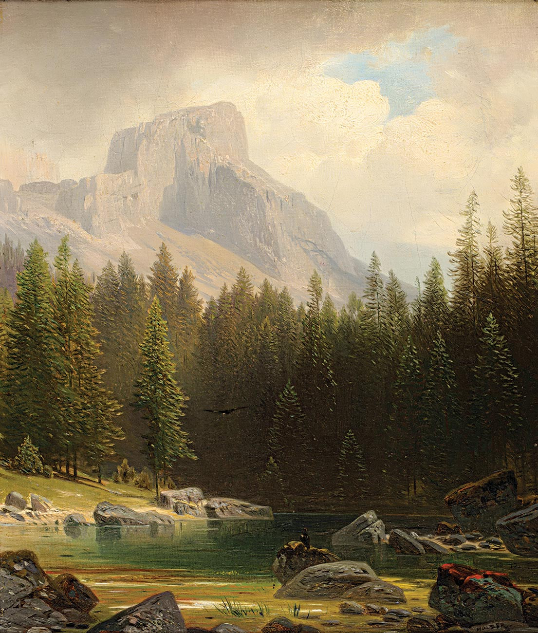 репродукция пейзажа художника Хольцера Жозефа — "Альпийское озеро с птицами"